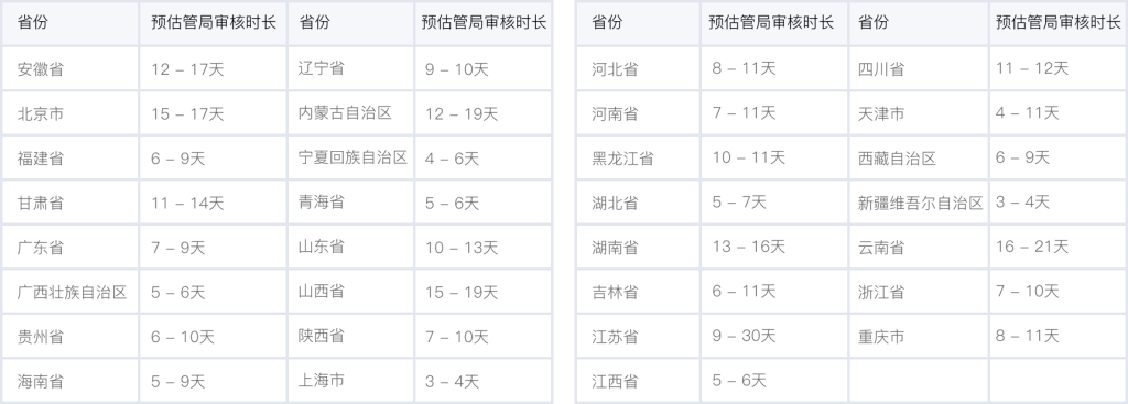 各個省管局預(yù)計(jì)審核時(shí)長,實(shí)際審核時(shí)長會根據(jù)備案場景有所不同,下表格僅供參考。詳情可查看 詳細(xì)規(guī)則。